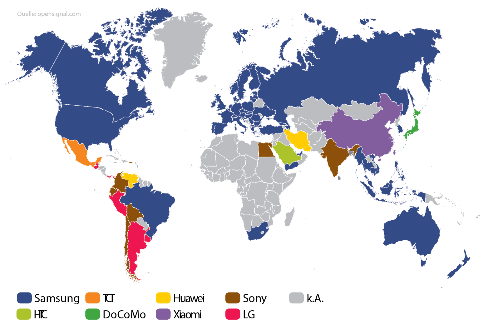 In der nördlichen Hemisphäre hat Samsung klar die Nase vorne. In Indien, Ägypten und einigen südamerikanischen Ländern führen Sony und LG. Japan und Mexiko werden von den lokalen Marken DoCoMo bzw. TCT dominiert.