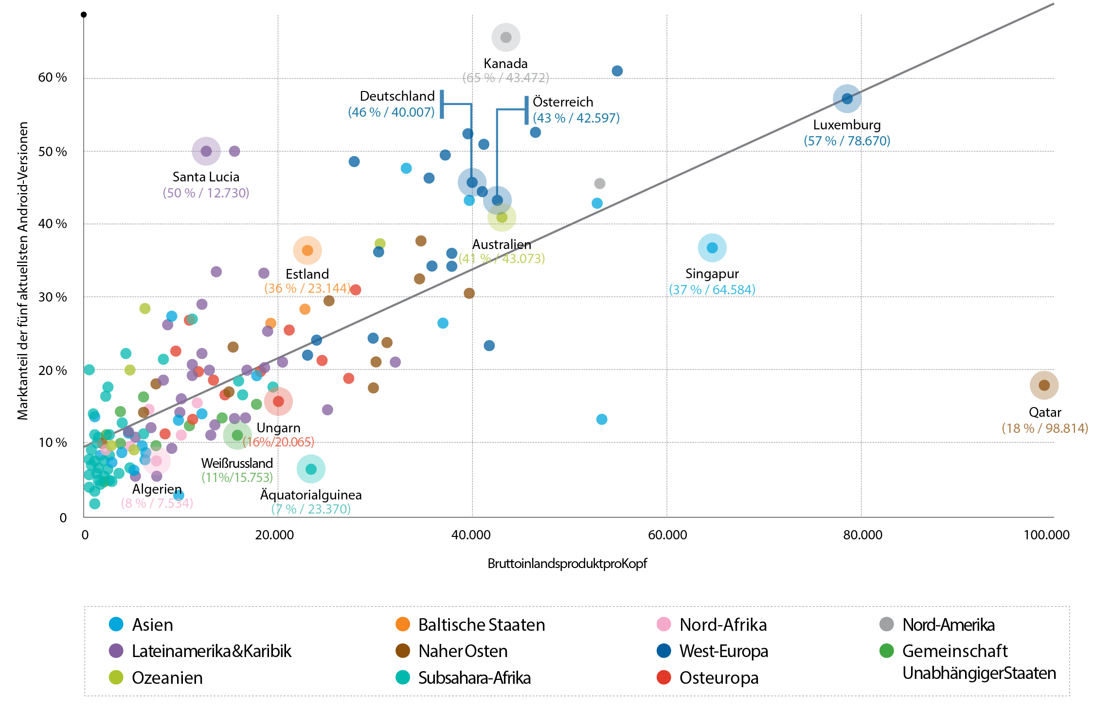 Dieses Streudiagramm von opensignal.com stellt die Aktualität der in einem Land verwendeten Android-Versionen in Beziehung zum jeweiligen Volkseinkommen (Pro-ÂKopf-BIP) dar. Wenig überraschend: In der Regel verwenden Nutzer in reicheren Ländern auch Smartphones mit neuerem Android. Interessant sind aber die Ausreißer wie Qatar (hohes BIP, trotzdem altes Android) und die Karibikinsel Santa Lucia (niedriges BIP, trotzdem neues Android).