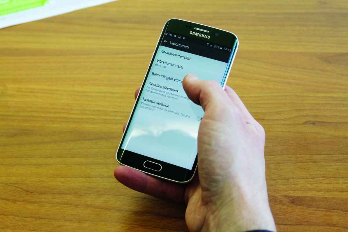 Die Hardware von Martins Samsung S6 ist edel, keine Frage. Trotzdem fühlt sich das Handy in meinen Händen etwas fremd an – und kantiger als mein iPhone 6S. Die Vibration ist mir zu ruppig, die werde ich gleich mal deaktivieren.