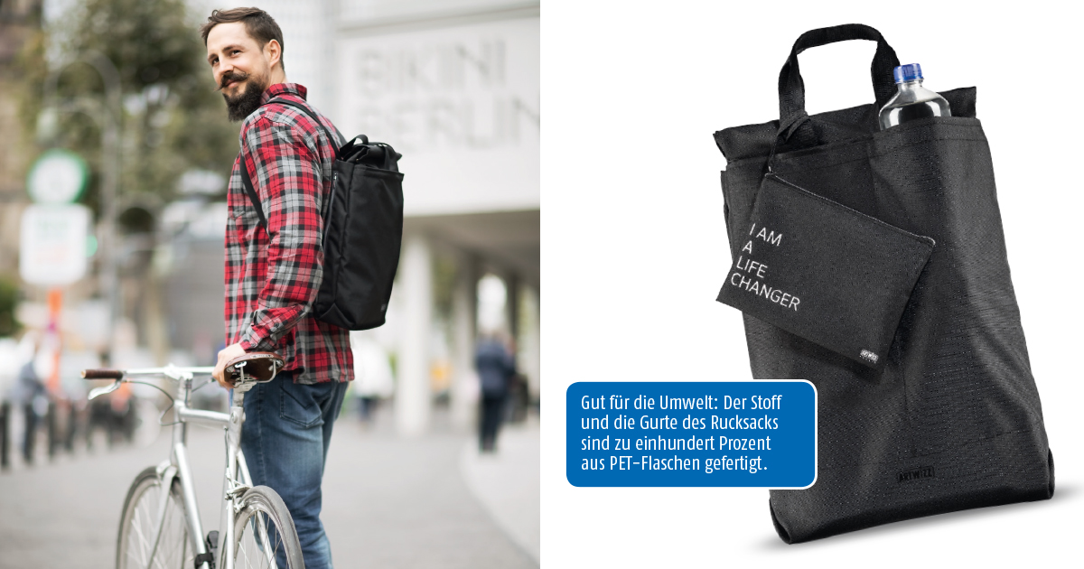 Smartphone, Notebook, Geldbörse, Akkupack, Ladekabel, vielleicht noch Unterlagen, Stifte: Wer viel unterwegs ist kennt die Schwierigkeit, alle kleinen und großen Gegenstände des Alltags in eine Tasche zu bringen. Die soll nämlich reichlich Platz bieten, nach Möglichkeit noch schön aussehen und im Optimalfall auch lange halten. Bei Artwizz ist man sich dieses Problems bewusst – und hat einen kreativen Weg gefunden, aus alten PET-Flaschen einen Rucksack zu fertigen, der gleichzeitig auch als Tragetasche verwendet werden kann.