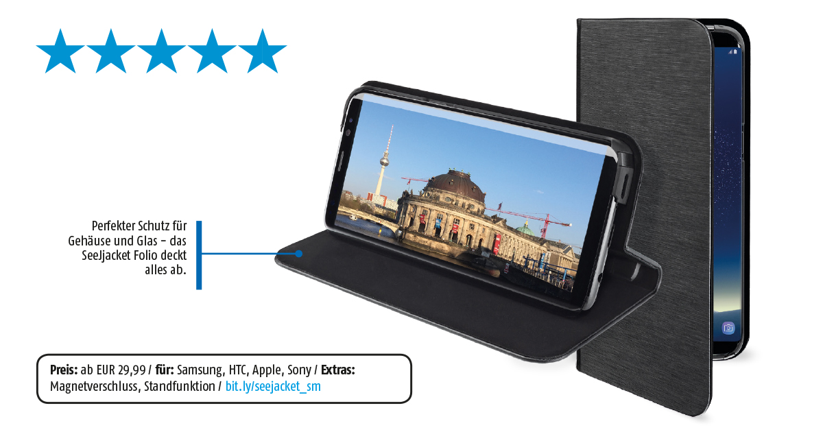 Ein unbedachter Moment und das Smartphone rutscht aus der Hand – und ist, wenn alles schlecht läuft, auch noch kaputt. Worauf wir hinaus wollen? Besser vorsorgen und ein passendes Case kaufen. So eines hat Artwizz im Portfolio, genannt „SeeJacket Folio“. Das Case deckt zum einen das komplette Gehäuse ab, schützt andererseits aber auch das Display. Zudem besitzt es eine praktische Standfunktion. Die vordere Abdeckung hält dank Magnetverschluss und die Microfleece-Beschichtung im Inneren schützt das Glas vor Kratzern. Erhältlich ist das SeeJacket Folio für diverse Smartphones von Samsung, Sony, HTC und Apple – auch alle neueren Modelle sind bereits vertreten. Preislich beginnt der Spaß bei 29,99 Euro für Cases für ältere Modelle. Das abgebildete SeeJacket Folio für das Samsung Galaxy S8 schlägt beispielsweise mit 36,99 Euro zu Buche.