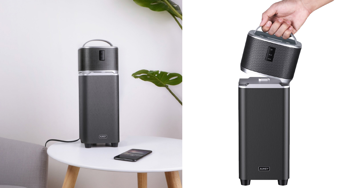 Dieser Bluetooth-Speaker ist ein Hybridgerät. Ein bisschen sieht er aus wie eine Gaslaterne für den Camping-Urlaub, ist aber eine Kombination aus mobilem und festem Sound-System. Der untere Teil wird an den Strom angeschlossen und lädt im Normalbetrieb das Oberteil. Jenes empfängt die Musikdateien per Funk oder Klinkenkabel und gibt Bass-Töne über einen Kontakt an der Unterseite an das Fußteil weiter. Wenn man das Top-Stück aber bei der Schlaufe packt und damit in den Park geht, läuft die Musik weiter, nur eben ohne so viel Bass (so groß ist der Unterschied aber nicht…). Das Laden geht auch per Kabel direkt, ist dann aber nicht so bequem.