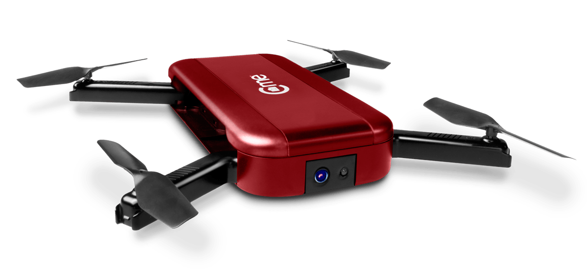 Die Rotoren der Kameradrohne C-me lassen sich einklappen – so dass das Gerät nur noch etwa die Größe eines Smartphones hat (allerdings deutlich dicker ist) und sich bequem transportieren lässt.