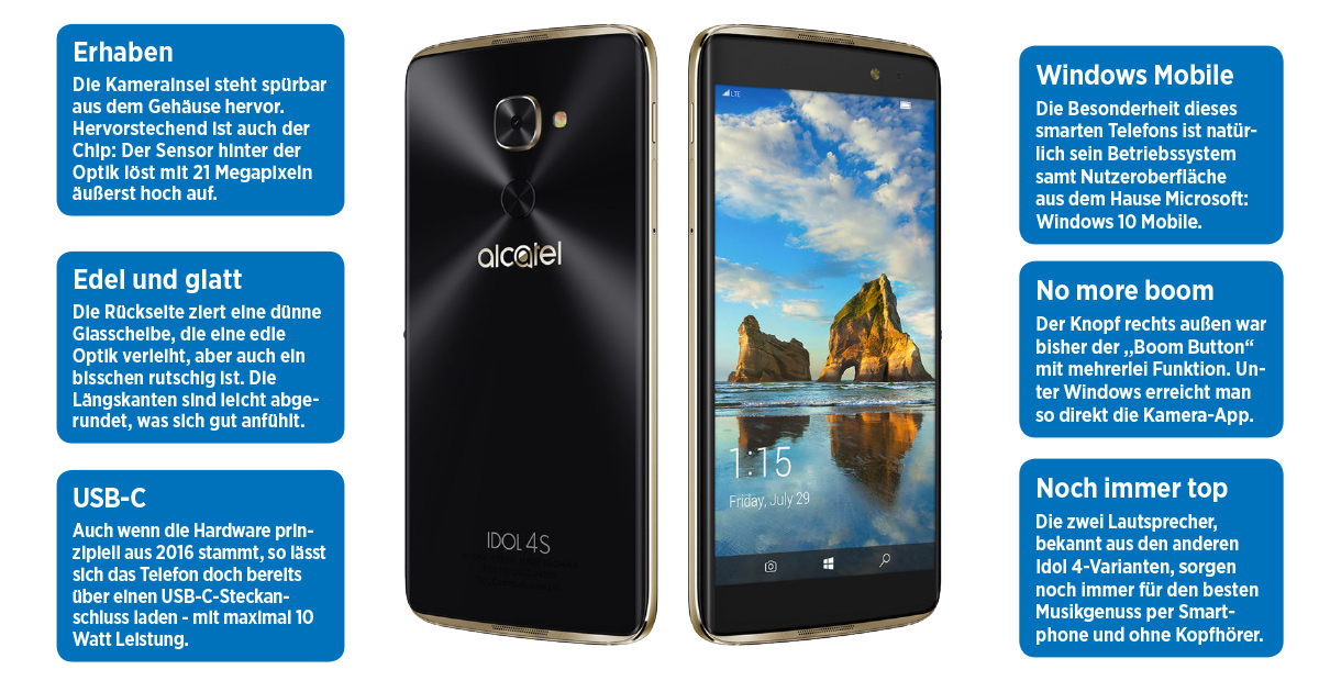 Neben der praktischen Software-Stärke durch die „Systemkompatibilität Windows“ (siehe Kasten oben), brilliert das Idol 4 Pro – wie auch seine Geschwister – über den besten Klang, den, zumindest unserer Meinung nach, ein Smartphone erzeugt. Die beiden über- und unterhalb des Schirms angebrachten Lautsprecher mit jeweils 3,6 Watt (!) stellen so manchen Bluetooth-ÂSpeaker locker in den Schatten. Auch weil die Membranen insgesamt vier Gehäuseausgänge haben. Sowohl Klangqualität als auch „Bumms“ sind beeindruckend. Von Bumms zu Boom: So hieß der kleine Knopf auf der rechten Seite. Unter Windows ist er etwas nüchterner geworden, aber noch immer nützlich. Er startet die Kamera.
