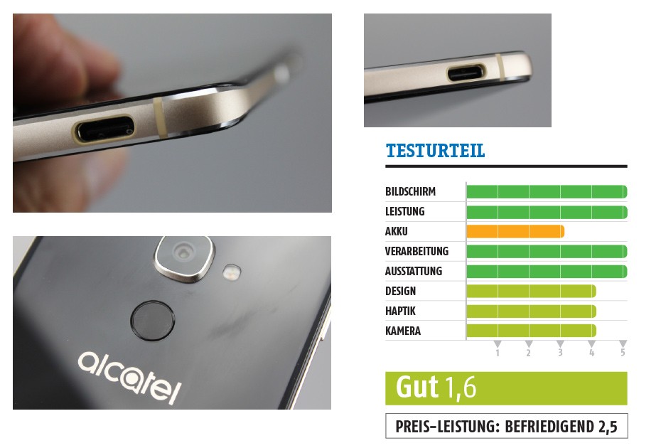 Neben dem Fingerabdrucksensor gibt es aber noch eine erkennbare Veränderung, für die man das Telefon gar nicht erst einschalten, aber doch ein bisschen genauer hinsehen muss. Auf der Unterseite ist nun eine symmetrische Buchse angebracht. Es gab also ein Upgrade von MicroUSB auf USB-C. WLAN ac war schon immer Idol 4-Standard, interessanterweise gab es bei der Bluetooth-Verbindung ein Downgrade auf 4.1. Relevant ist das in der Praxis aber kaum.