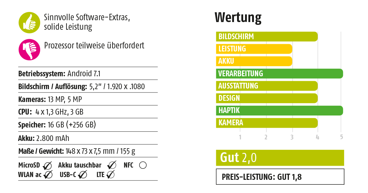 Für ausreichend Leistung sorgt ein Vierkern-Prozessor aus dem Hause Mediatek, der zwar zuverlässig arbeitet, ab und an aber seine schwache Brust erkennen lässt. Positiv: Alcatel spendiert dem Idol 5 einige Software-Extras, unter anderem den „Now Key“, eine virtuelle Taste für den Schnellzugriff auf Funktionen. Außerdem lassen sich Social Media-Anwendungen duplizieren, wodurch Sie zwei Accounts gleichzeitig anlegen können.