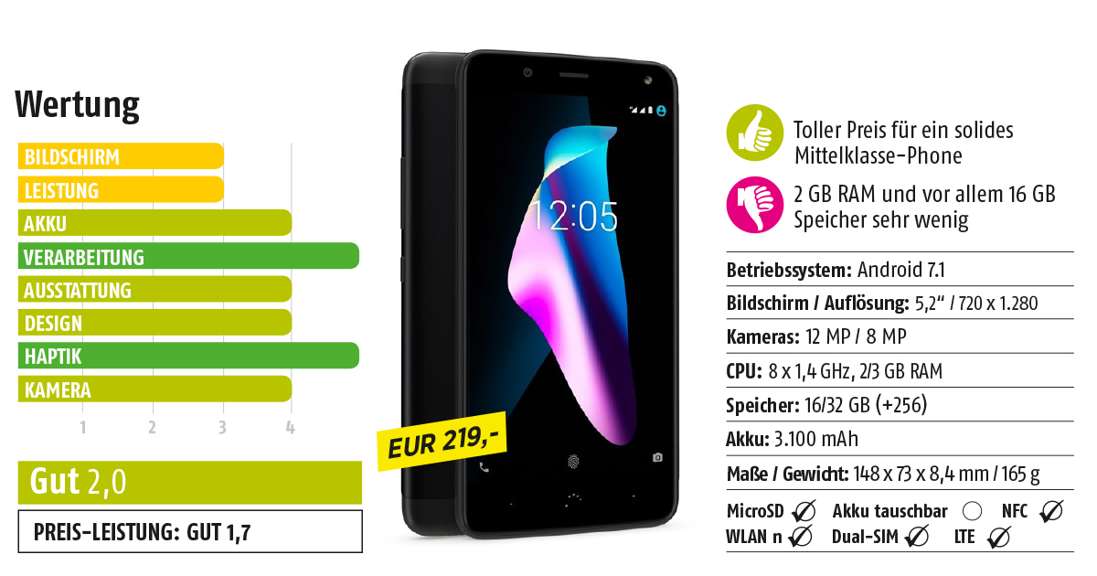 Rund 220 Euro soll diese schicke Teil hier kosten, was angesichts der guten Leistungsdaten, die wir im Test erheben konnten, mehr als fair ist. BQ hat mit dem Aquaris V ein solides Smartphone der Mittelklasse im Portfolio, das vor allem mit einer hochwertigen Kamera und durchdachten Extras punktet. Tatsächlich konnte die Kamera im Test überzeugen, wenngleich zur absoluten Leistungsspitze noch Aufholbedarf besteht. QuickCharge und ein 3.100 mAh-Akku gefallen, das HD-Display eher weniger. Erhältlich mit 16 oder 32 GB Festspeicher bzw. 2 oder 3 GB RAM.