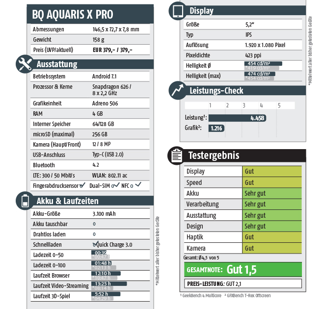 Diese Namenszusätze kennen wir zur Genüge: „Plus“ wie Mehr, „Max“ wie Maximum und „Pro“ wie Professional. Gemeint ist damit immer dasselbe: Noch ein bisschen größer, noch ein bisschen besser. Im Falle dieses spanischen Smartphones sind wir aber gespannt, ob das Versprechen eingelöst werden kann – schließlich ist das Aquaris X Pro kein zeitgleich erschienenes „Big Brother“-Gerät zu einem Flaggschiff-Phone (wie z.B. bei Samsung), sondern eigentlich der Nachfolger zum letztjährigen Top-Handy von BQ. (Eigentlich deshalb, weil das 2016er Modell noch immer direkt über die Hersteller-Webseite zu beziehen ist.) Jenes Aquaris 5X Plus hat uns damals überrascht und sehr gute Noten erhalten. Seitdem hat sich aber einiges getan und die Ansprüche sind gewachsen. Eine Frage lautet also: Ist das Aquaris X Pro auch im Vergleich mit der aktuellen Konkurrenz noch ein bisschen besser geworden? Eine andere: Kann es sein gutes Preis-Leistungs-Verhältnis verteidigen? Unterziehen wir es einem professionellen Test…