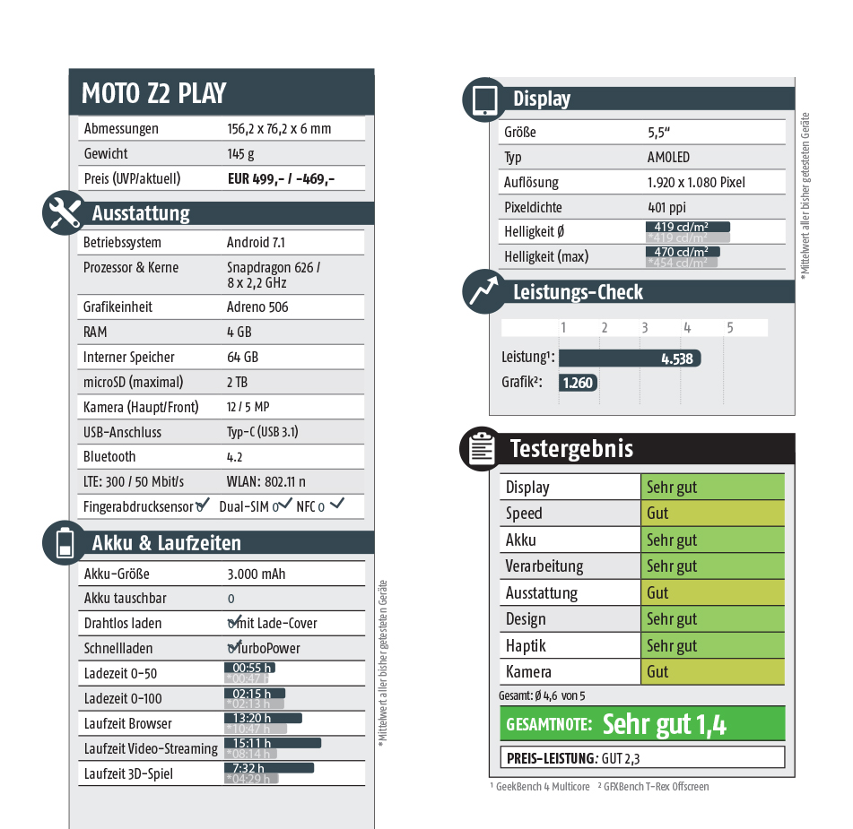 Das Moto Z Play hat(te) ein ganz besondere Stärke, und das sind seine Laufzeiten. In unserem Akku-Ranking belegte es bis vor Kurzem den zweiten Platz. Abhängig vom Blickwinkel sogar den ersten. Denn in den gemessenen Zeiten musste es sich nur knapp geschlagen geben, lag allerdings bei den Ladezeiten deutlich an der Spitze (will sagen: am schnellsten). Das Z2 Play hat da gleich mit erheblichen Startwidrigkeiten zu kämpfen. Sein Akku wurde um 510 mAh beschnitten, fasst nun „nur“ noch 3.000 mAh. Das Ergebnis sind kürzere Standzeiten in allen Testkategorien. Das ist im Gesamtvergleich noch immer sehr gut, aber eben nicht mehr absolute Spitzenklasse. Wirklich wundern mussten wir uns aber über die gemessene Ladegeschwindigkeit. Die war trotz kleinerem Akku und „TurboPower“-Ladegerät eklatant niedriger als beim Vorgänger. Dass ein größerer Akku beim Laden besser startet, da der Widerstand geringer ist, wissen wir. Aber beim Durchladen müsste der kleinere Akku auch schneller sein. 2:15 Stunden statt 1:41 (Moto Z Play) sind ein Rückschritt bei der Nutzbarkeit.