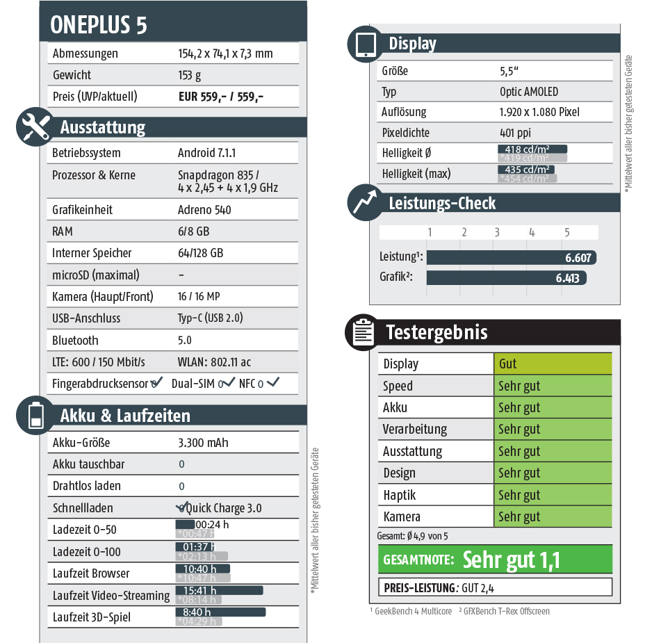 Das beweist auch unser Labortest: Das OnePlus 5 liegt leistungstechnisch genau zwischen dem Samsung Galaxy S8 und dem Galaxy S8+, die Unterschiede sind ohne Benchmark-Tests allerdings nicht zu erkennen. Andere Spitzenmodelle werden teils deutlich abgehängt, was hauptsächlich an den 8 GB Arbeitsspeicher liegen dürfte. Da erklärt es sich von selbst, dass keine App die Hardware an ihre Grenzen bringen konnte, ausnahmslos alle Aktivitäten liefen im Test butterweich. Dabei müssen wir erwähnen, dass wir die „große“ Variante im Test hatten, das OP5 konnte also auf satte 8 GB RAM zugreifen. Wer damit liebäugelt, sich das 6 GB-Modell zuzulegen: Auch das wird sich in ähnlichen Leistungsgefilden ansiedeln, 64 GB Festspeicher sind für den Normalverbraucher darüber hinaus wohl ebenfalls ausreichend. Der Speicher lässt sich in beiden Modellen allerdings nicht mehr erweitern.