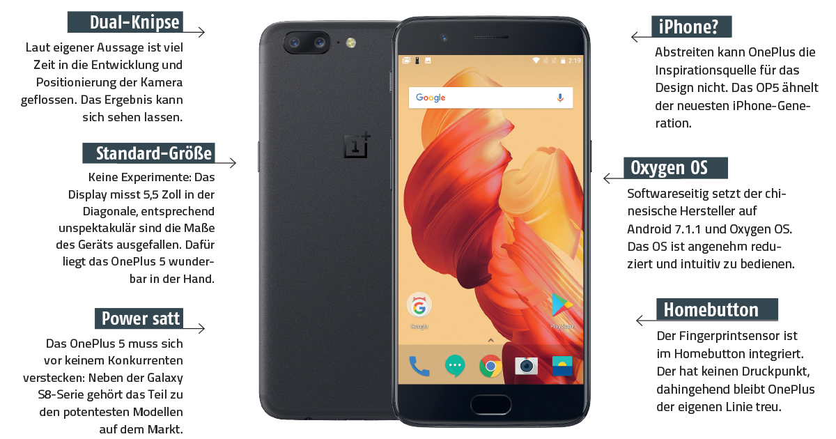 Verpackt ist die Hardware in einem Unibody aus Aluminium. Optische Anleihen an der neuesten iPhone-Generation lassen sich nicht bestreiten, das macht OnePlus aber auch gar nicht. Im Gegenteil: In einem Video bedankt sich Pete Lau, CEO des Unternehmens, bei Apple. Das Kultunternehmen aus Cupertino habe das Design gewissermaßen salonfähig gemacht. Außerdem sei es nicht einfach, die Dual-Knipse formschön im Gehäuse unterzubringen. Insofern dürfte es in optischer Hinsicht nicht viele andere Möglichkeiten gegeben haben. Die Knipse steht allerdings leicht aus dem Gehäuse hervor, das Gerät liegt also nicht ganz plan auf. Störend ist das nicht, und wer sich für ein rückseitiges Case entscheidet, löst dieses Problem recht einfach und zugleich formschön. Unabhängig davon sieht das OnePlus 5 toll aus, liegt hervorragend in der Hand und ist sauber verarbeitet. Einziger kleiner Kritikpunkt: Eine IP-Zertifizierung fehlt vollends, nass werden sollte das OnePlus 5 also nicht.