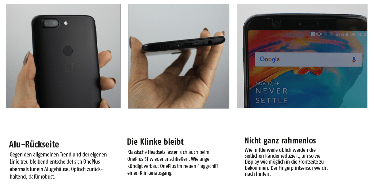 Ansonsten ändert sich nichts mehr. Das OnePlus 5T ist aber ohnehin zeitgemäß ausgestattet. WLAN ac ist ebenso Standard wie Bluetooth 5.0. Eine Möglichkeit zur Speichererweiterung fehlt, das fällt bei 64 oder 128 GB Festspeicher aber nicht allzu sehr ins Gewicht. Dafür passen zwei SIM-Karten in den Schlitten. Geladen wird übrigens mit USB Typ C 2.0, der neueste Standard fehlt. Dafür ist eine traditionelle Klinkenbuchse verbaut.