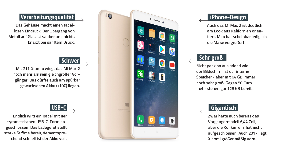 Einer dieser Preisbrecher mit den eingangs erwähnten Ausstattungsmerkmalen ist das Mi Max 2 von Xiaomi, das zunächst alleine durch seine schiere Größe aus der Masse der Smartphones herausragt. 6,44 Zoll in der Diagonale bei konventioneller Bauweise, d.h. nicht „randarm“ wie bei LG G6 oder Samsung Galaxy S8) führen zu einer Grundfläche von fast 9 x 17,4 cm. Ein Gameboy in den 80er Jahren war kleiner! Damit ist dieses Gerät das größte seiner Art, das im Jahr 2017 die Weltbühne betrat. Richtet man seinen Blick nun vom großen Ganzen auf die Details, wird die Wahlverwandtschaft zum iPhone mehr als deutlich. Die Glasscheibe über dem Display ist leicht gewölbt, das Gehäuse aus Aluminium eloxiert, dessen Ecken sanft geschwungen wie beim US-Vorbild und selbst die Einlassungen aus Kunststoff für sauberes Funktionieren der Antennen, sind genauso positioniert wie bei Apple. Das Mi Max 2 sieht einfach aus wie ein iPhone 7 auf der Streckbank. Aufgeblasen wäre falsch, denn der Xiaomi-Riese ist kaum dicker.