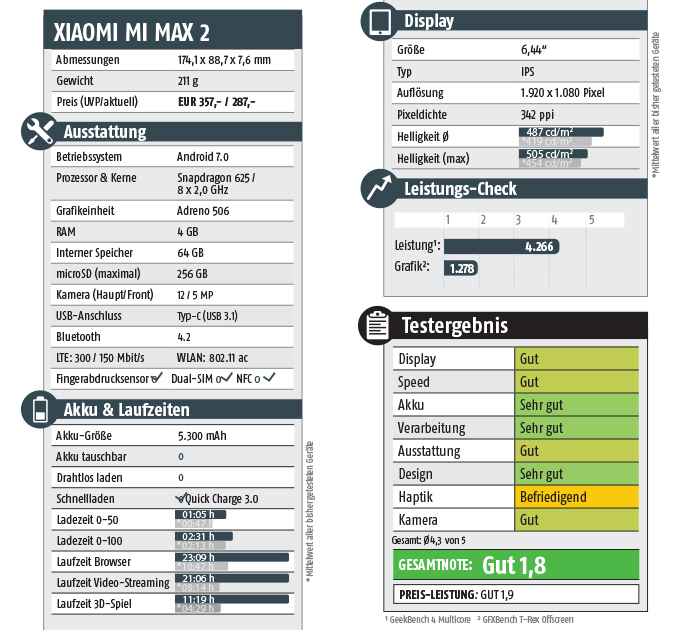 Dafür ist der chinesische Koloss satte 73 Gramm schwerer als ein iPhone 7 (und 23 g schwerer als ein iPhone 7 Plus) und bringt immerhin noch 8 Gramm mehr auf die Waage als sein Vorgänger mit gleichgroßem Schirm. Warum? Der Akku wuchs um 450 mAh auf respekteinflößende 4.300 mAh. In Relation zur Leuchtfläche mag das wieder weniger beeindrucken, aber nach der Zeitennahme wissen wir: Dieser Sumo-Ringer hat echte Steherqualitäten. Der Akku wollte und wollte einfach nicht leer werden, was darin resultierte, dass wir einen neuen Spitzenreiter haben. „Max“ steht also nicht nur für maximalen Bildschirm (der mit 1.920 x 1.080 Pixeln angesichts der Größe gar nicht so fein auflöst), sondern auch für maximale Laufzeiten.