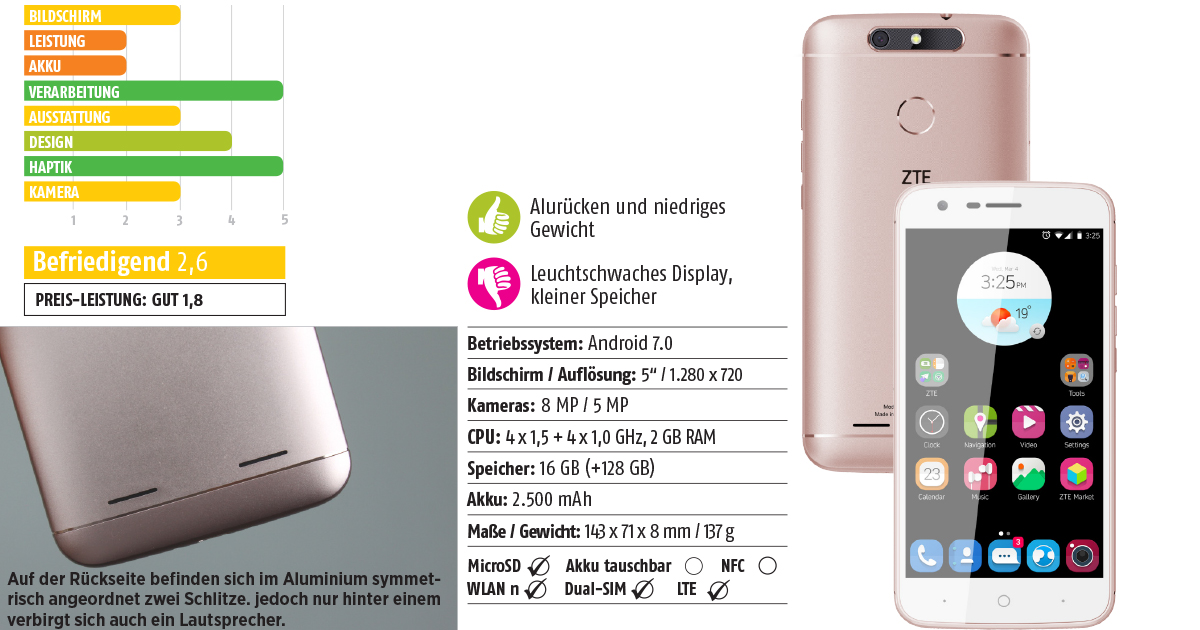 Dieses Gerät wurde bereits auf dem MWC im Frühjahr vorgestellt, gelangt aber erst jetzt auf den deutschen Markt und war bis Redaktionsschluss noch nirgends im deutschsprachigen Raum erhältlich. Der Preis dürfte aber deutlich unter 200 Euro starten. Dafür gibt es das typische ZTE-Gehäuse mit Alu-Rücken, der länglichen Kamerainsel (allerdings ist hier nur eine Linse verbaut) und dem kreisrunden Fingerprint-Sensor. Mit einer Speichergröße von 16 GB qualifiziert sich das Smartphone nicht zwingend aus der Box heraus für den Gebrauch in den Händen eines sogenannten Power Users, aber immerhin lässt sich der Speicher per SD-Karte aufstocken. Unsere Laufzeittests ergaben für das Telefon keine Wunderzahlen – keine Überraschung, schließlich ist der Akku nicht sonderlich groß. Dafür wiegt das kleine Ding aber auch nur 137 Gramm. Für ein Metallgehäuse nicht schlecht.