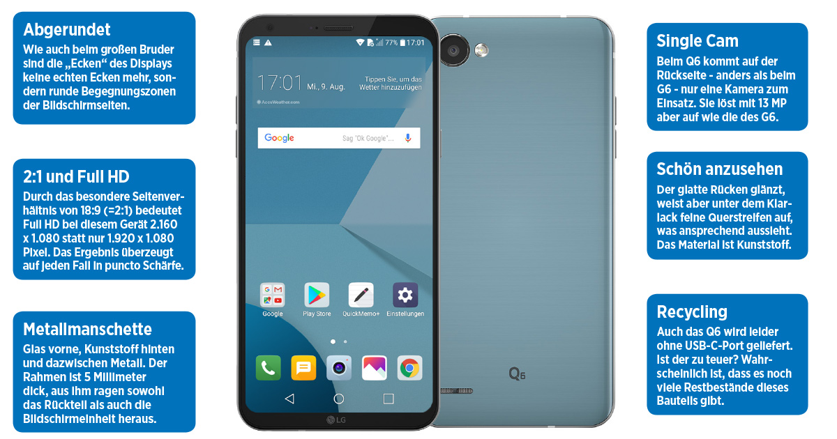 Im Grunde handelt es sich also um ein Dilemma, also ein unlösbares Problem. Doch es gibt Raum für Verbesserung. Und dieser Raum nennt sich Rand, Rahmen oder Bezel, wie man im Englischen sagt. Bei den meisten bisherigen Smartphones ist der Bildschirm nämlich flankiert von mehr oder weniger breiten Bereichen ohne Funktion. Man könnte also den Schirm auf Kosten dieses Brachlandes vergrößern und dadurch verhindern, dass sogleich das ganze Telefon in die Breite und Höhe geht. Vorgemacht hat dies das Xiaomi Mi MIX, nachgemacht das Samsung S8 und das LG G6. Und jetzt gibt es das große Display im kleinen Gerät auch in der preislichen Mittelklasse, im LG Q6.