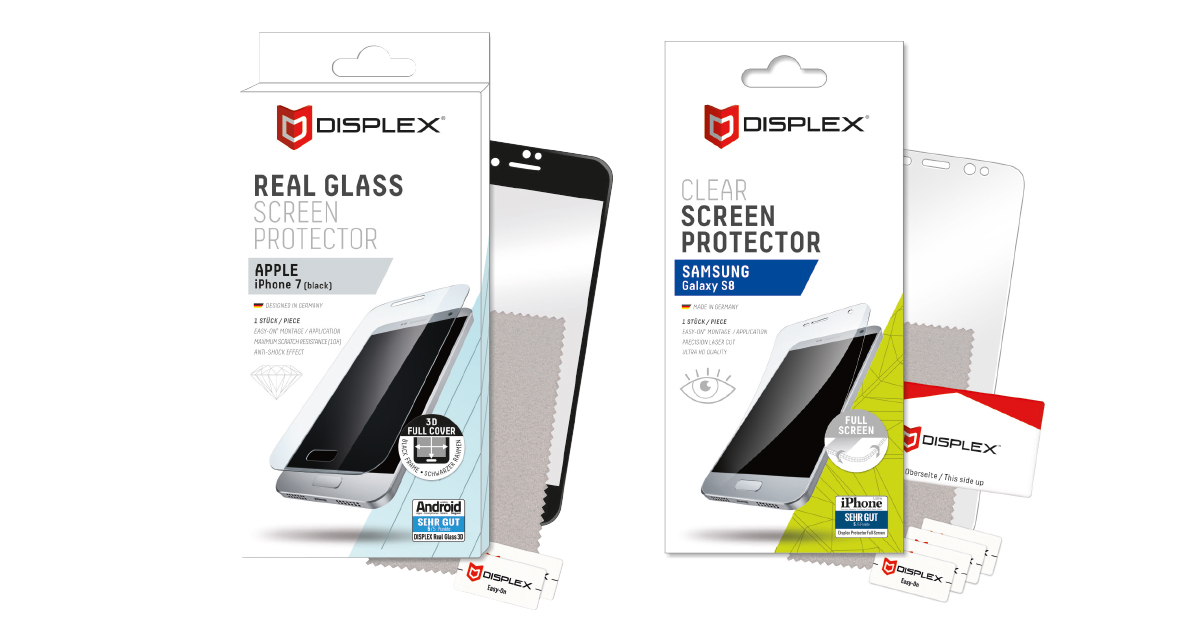 Wer für ein neues Smartphone zwischen 200 und 1.000 Euro ausgibt (darunter geht es kaum und die Obergrenze ist mittlerweile tatsächlich realistisch geworden), will schnelle Beschädigungen natürlich vermeiden. Schaden Nummer 1 ist ein gesplittertes Display-Glas. Davor schützt vor allem eine Folie auf dem Bildschirm. Displex bietet solche Schutzfolien sowohl aus Echtglas als auch aus Kunststoff an. Gerade für das beliebte Samsung Galaxy S8 mit der Edge-Kante muss die Glas-Variante speziell geformt sein und an jeder Stelle exakt aufliegen, um die Funktionalität zu gewährleisten. Die Passgenauigkeit ist hier gegeben und auch die exakte Anordnung der Sensoraussparungen – beim schmalen Rand des S8 ist hier nicht viel Spielraum.