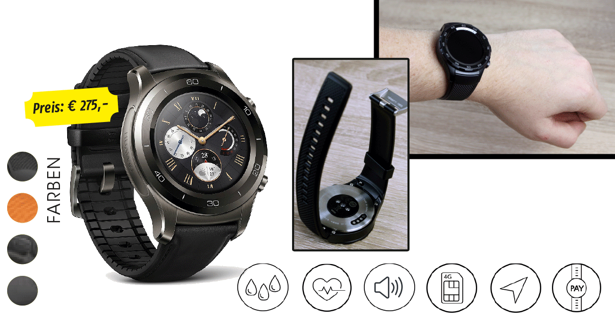 Die Huawei Watch 2 ist seit einigen Monaten erhältlich und mittlerweile auch schon im Preis gesunken. Der ist abhängig von der gewählten Ausstattung: Die Variante mit Sportarmband aus einer Art Gummi ist günstiger als das schickere Modell mit Lederarmband und Edelstahlgehäuse. Das Display misst bei beiden Ausführungen 1,2 Zoll im Durchmesser und ist gänzlich rund gehalten. Umrandet ist das Display von einem höheren Ring, wodurch der Bildschirm zusätzlich geschützt ist. Dadurch ist die Huawei Watch aber ein wenig dicker als andere Modelle, wirklich störend ist das aber nicht. Positiv: Die Uhr ist nach dem IP-Standard IP68 gegen Wasser und Staub geschützt.