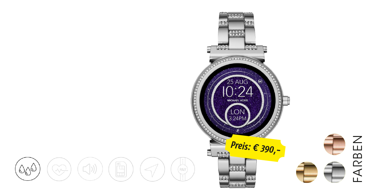 Ganz klar zu erkennen: Dieses Schmuckstück richtet sich an weibliche Tech-Fans. Die Uhr wird unter dem Label des bekannten Designers Michael Kors vertrieben und versucht, ein edles Gehäuse mit modernster Technologie zu verbinden. Das Gehäuse hat einen Durchmesser von 42 Millimeter, für ganz zarte Hände ist das grenzwertig. Dafür ist sie nicht allzu dick und auch das Gewicht hält sich angenehm in Grenzen. Als Betriebssystem kommt Android Wear zum Einsatz, der Träger hat also vollen Zugriff auf alle bekannten Funktionen.