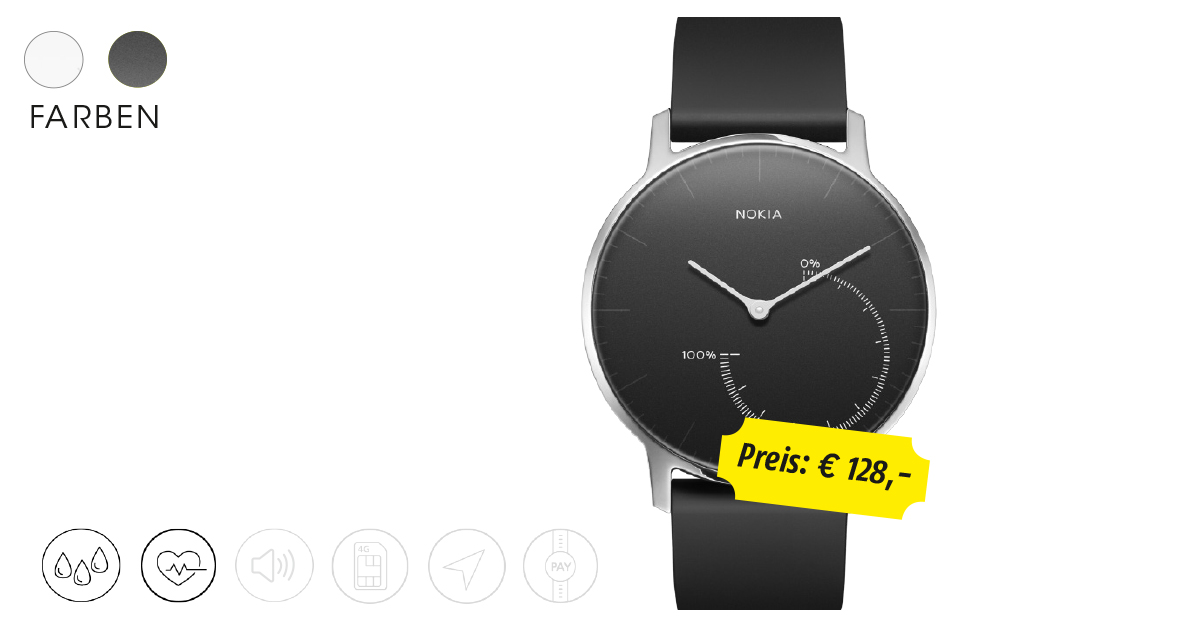 Dieses dezente Modell erinnert Sie vielleicht an ältere Hybrid-Uhren von Withings. Das Unternehmen wurde vor einiger Zeit von Nokia übernommen, weshalb der kultige Hersteller nun eben auch Uhren vertreibt. Gedacht ist die Uhr hauptsächlich für den Fitness-Bereich, dank des hübschen Designs macht die Steel aber auch auf der Abendveranstaltung eine gute Figur. Dort und da werden die wichtigsten Vitaldaten des Trägers aufgezeichnet und in eine eigens entwickelte App übertragen. Gemessen werden Schritte, gelaufene Strecken, Schlaf und Kalorienverbrauch.