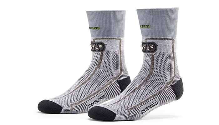 Es gibt kaum ein Kleidungsstück, in das findige Hersteller nicht einen Sensor packen. Der letzte Schrei: Die smarte Socke. Drei Drucksensoren sind in die „Smart Socks“ der Marke Sensoria eingenäht – jeweils einer an den Fersen und zwei an den Fußballen. Vorne, im Bereich des unteren Schienbeins, befinden sich Magnetkontakte, an die ein Tracker geklipst wird. Dieser sendet die Daten während des Laufens ans Smartphone, der Sportler erhält in Echtzeit Rückmeldungen zu seinem Laufstil. So kann er den Bodenkontakt, das Abrollverhalten und die Schrittzahl pro Minute optimieren. Das soll helfen, Verletzungen und Gelenksschäden zu vermeiden.