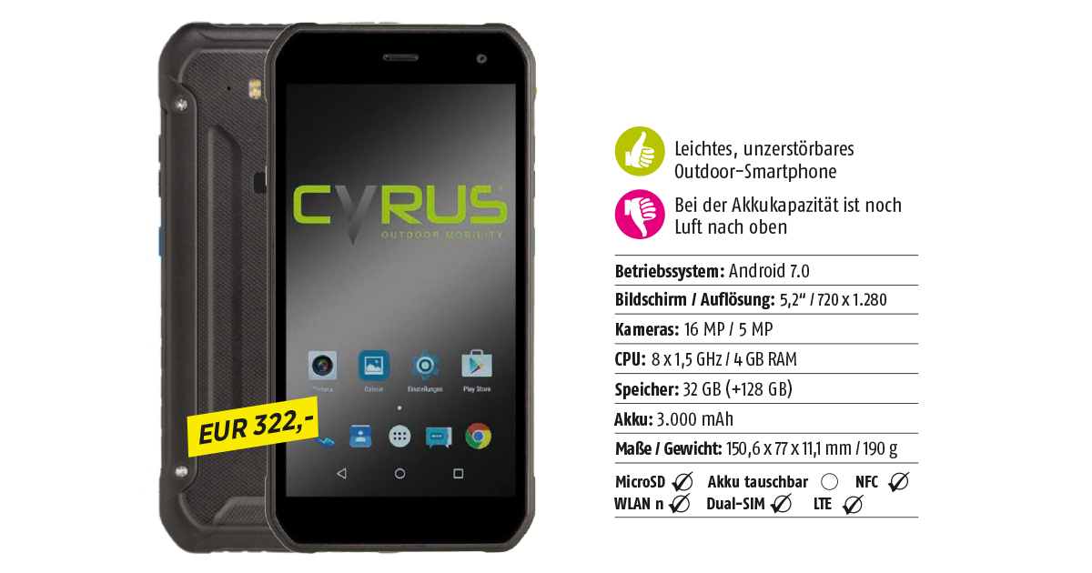 Ähnlich wie das Trekker-X3 wurde das stoßfeste, wasser- und staubdichte CS 40 speziell für Abenteurer entwickelt. Etwas leichter als das Trekker-X3 läuft das bei Temperauren zwischen -25 und 55 Grad Celsius einsatzbereite CS 40 mit Android 7.0. Das deutsche Gerät wurde mit einem 5,2 Zoll HD-Bildschirm sowie 32 Gigabyte internem Speicherplatz versehen. Letzterer kann per SD-Karte um maximal 128 Gigabyte erweitert werden. Neben Features wie einer GPS-Funktion erfüllt das CS 40 in Sachen Schutz gegen Umwelteinflüsse auch einen wichtigen US-Militärstandard (MIL-810G).