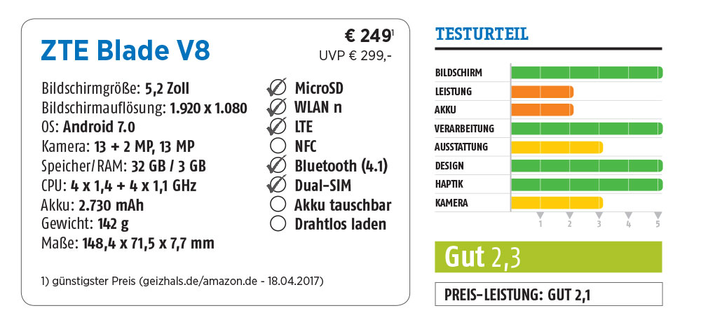 Die Blade V-Reihe von ZTE hat schon in den frühen Tagen der chinesischen Marke auf europäischem Boden für zaghafte Bewunderung gesorgt, und zwar vornehmlich wegen des schnörkellosen Äußeren: ein dünnes Aluminiumgehäuse hat einfach seinen Reiz. Beim aktuellsten Vertreter der Serie blieb dieses Verkaufsargument, dazu gesellte sich aber ein weiteres – nämlich eine Kamera, die auch Tiefeninformationen sammelt und daher nachträglich die Justierung des Schärfepunktes zulässt. Man kennt dieses Feature von HTC, Huawei und Honor. So günstig wie beim Blade V8 war es jedoch noch nie nutzbar. Und ja, die Kamera funktioniert tatsächlich, wenngleich die Übergänge vom scharfen in den Unschärfebereich zum Teil sehr hart und nicht ganz plausibel von der Software kalkuliert werden. Über einen 3D-Modus können überdies Bilder erstellt werden, die man sich später über eine VR-Bille ansehen kann. Praktisch, dass ZTE mit der Verpackung des Blade V8 gleich eine solche liefert (wenngleich auch ein wenig gebastelt werden muss). Die „normale“ Fotoleistung ist okay, aber nicht herausragend. Ähnliches lässt sich über die Recheneinheit sagen. 1,4 GHz maximale Taktfrequenz lassen keine großen Sprünge zu. Angenehm ist dagegen der interne Speicher mit 32 GB. Damit lässt sich auch ohne SD-Karte Âhaushalten. Mit Kärtchen stehen aber weitere (maximal) 128 GB zur Verfügung. Der Akku ist weder Riese noch Zwerg, die Laufzeiten platzieren das Gerät Âjedoch eher im unteren Mittelfeld. Da die Batterie nicht gewechselt werden kann, steckt man das gesparte Geld am besten in eine Powerbank.