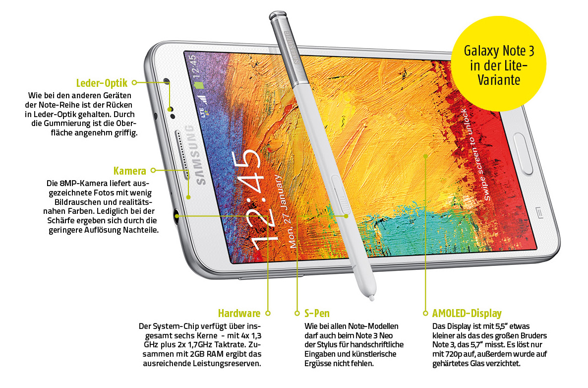 Zurück auf die Vorderseite: Das verbaute Panel ist ein AMOLED mit den gewohnten Vorzügen und Nachteilen: Hohe Leuchtkraft, Farbstärke und Blickwinkelstabilität stehen geringerer Exaktheit bei den Farbwerten gegenüber. Die Auflösung wurde für die Neo-Variante aus Kostengründen reduziert und beträgt 1.280×720 statt Full HD. Das ergibt bei 5,5 Zoll aber immer noch eine Pixeldichte von 267 ppi – keineswegs ein schlechter Wert. Wir folgen dem Sparstift weiter zur Rechner-Hardware: Statt des Snapdragon 800 kommt ein Samsung-eigener Exynos Chip mit vier 1,3GHz plus zwei 1,7GHz-Kernen zum Einsatz – insgesamt also sechs Kerne. Die Rechenleistung bleibt damit zwar hinter dem großen Bruder Note 3 zurück (was zum Teil auch dem Wert von 2GB statt 3GB RAM geschuldet ist), im täglichen Gebrauch ist die Leistung jedoch mehr als genug, Ruckeln oder lange Reaktionszeiten vermerkten wir im Test nicht.