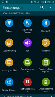 Die TouchWiz-Benutzeroberfläche präsentiert sich moderner und aufgeräumter als bisher. Icons erstrahlen im trendigen Flat-Design, auch die vorinstallierten Hintergründe setzen auf abstrakte Formen und weiche Farbverläufe. Interessant ist auf alle Fälle auch, dass Samsung Google-Apps mehr in den Vordergrund rückt und seine eigenen Samsung-Pendants im App-Drawer versteckt. Für Branchen-Kenner ist dies wenig überraschend, haben sich Google und Samsung doch erst kürzlich auf einen Patent-Austausch sowie eine generell kooperativere Vorgehensweise geeinigt. Eine tiefgreifende Änderung ist in den Einstellungen zu finden: Anstatt wie bei Android üblich die einzelnen Menüpunkte in Listenform darzustellen, gliedern sich die Systemeinstellungen beim Galaxy S5 in bunte, runde Icons. Das ist anfangs etwas ungewohnt, bietet aber dank durchdachter Kategorien und aussagekräftiger Menünamen einen echten Mehrwert in Sachen Benutzerfreundlichkeit.