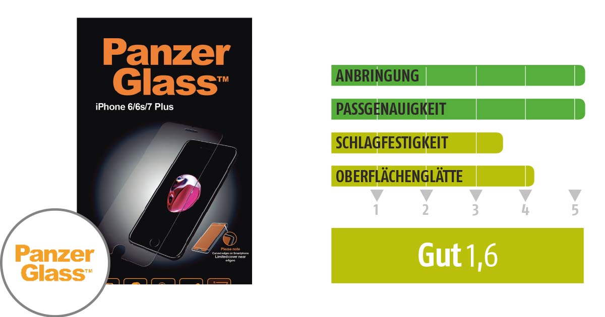 Panzerglass (auf Deutsch ließe man ein ‚s‘ weg), das ist schon ein klingender Name, der die Ârichtigen Assoziationen hervorruft. Er ist sogar so stark, dass andere Marken sich dieses Attribut anheften. Erstaunlicherweise schnitt gerade in unserem Kollisionstests diese Glasfolie nicht besonders gut ab. Bereits bei einer Fallhöhe von 60 cm (allerdings mit der spitzen Seite des Projektils) konnte die Scheibe verletzt werden – und das, obwohl es sich nach unserer Messung um die dickste Folie im Vergleich handelt. Eine Aussparung für die Selfie-Kamera gibt es auch hier nicht (das kann wie gesagt auch ein Vorteil sein). Uns wunderte die Angabe, dass die Folie auch für das iPhone 7 geeignet sei. Warum machen das alle anderen Marken nicht auch so?