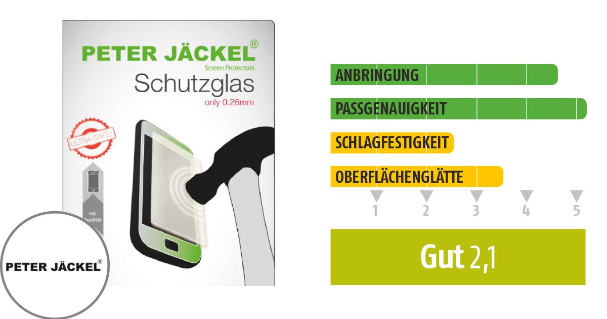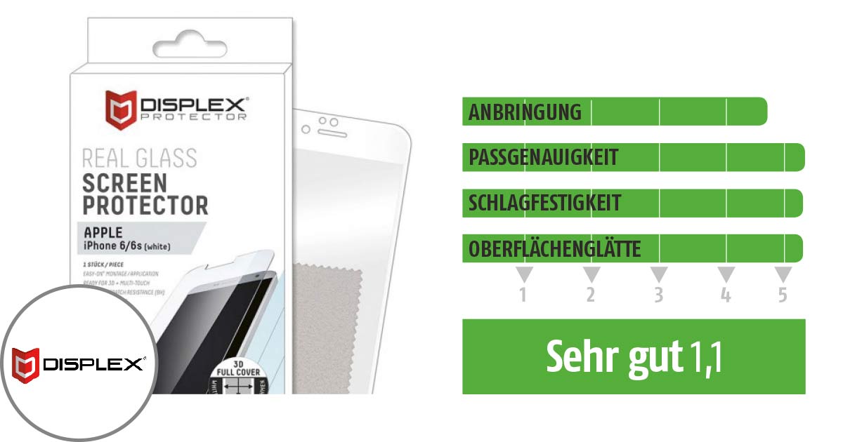 Die Real Glass-Folie von Displex landete bei uns auf dem geteilten ersten Rang – nicht nur weil das Paket aller Qualitätskriterien den höchsten Durchschnittswert erzielte und dazu noch ein vergleichsweise niedriger Preis für das Glas verlangt wird, sondern vor allem, weil das Ergebnis im Schlagtest ohne Tadel war. Sogar der „Kuss“ mit dem spitzen Ende unseres Metallprojektils aus einer Fallhöhe von 1,5 Metern konnte die dünne Glasschicht nicht verletzen. Danach haben wir aufgegeben… Schön wäre, wenn der Hersteller noch einen Klebefilm beigeben würde, mit dem sich Staubpartikel sicherer entfernen ließen als mit dem Tuch. Staub oder anderer Schmutz unter dem Glas sind problematisch bei der Anbringung.