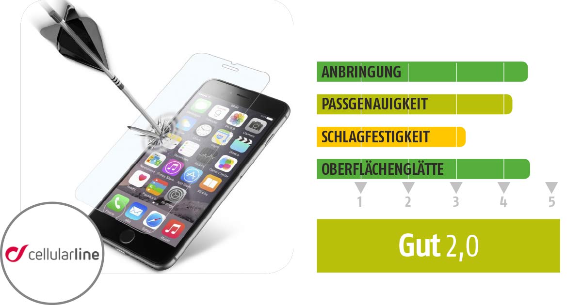 Der Zagg-Folie nachgereiht haben wir die von Cellularline, weil die Schlagfestigkeit auf niedrigerem Niveau ist. Es reichte einmal ein Einschlag unseres Projektils aus 30 cm Höhe, um die Oberfläche zu beschädigen. Dabei kam nicht einmal die spitze Seite zur Verwendung. Ansonsten fielen auch noch andere Eigenschaften auf: Geschützt wird das Glas nur von einer „Transportfolie“, das ist aber vernachlässigbar. Sowohl die Sensoren oben als auch der Homebutton unten waren sehr großzügig ausgeschnitten – wie bei keinem anderen Glas im Test. Das sieht nicht nur günstig aus, sondern fühlt sich auch nicht gut an und schützt weniger. Außerdem hatten wir mit der sehr schwer zu öffnenden Verpackung zu kämpfen.