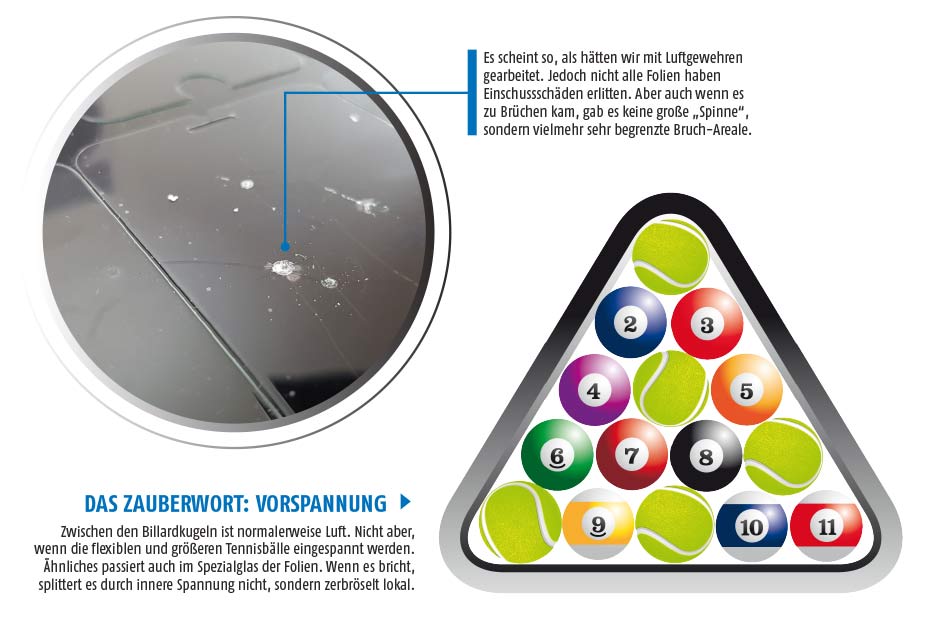 Da die Kugel auch bei größerer Fallhöhe nur wenig Schaden anrichten konnte, folgte die Kollision mit einem in einem Fallrohr geführten 27 g schweren und 6,8 mm starken Metallprojektil (spitze und stumpfe Seite). Manche Folien überlebten sogar das.