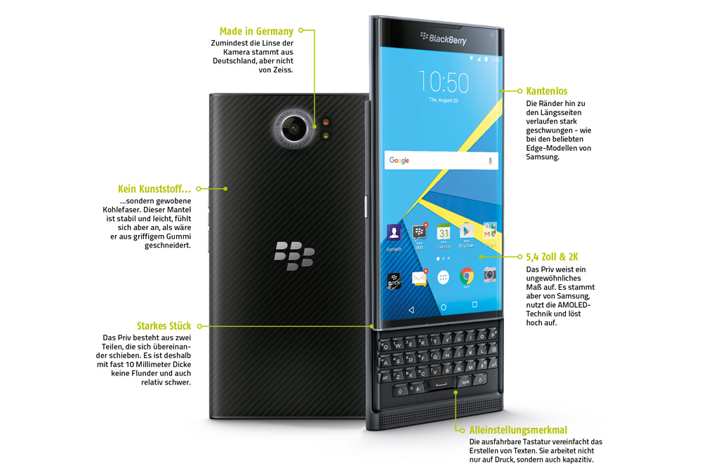 Wohl deshalb hat Blackberry die Notbremse gezogen und nun das erste Android-Gerät auf den Markt Âgeworfen. Wahrscheinlich sollen dadurch auch ÂPrivatkunden gewonnen werden (für die DatenÂsicherheit nur sekundär ist). Der bekannte ÂBlackberry Enterprise Service ist aber auch hier verfügbar, wenngleich eingeschränkt. Zusätzlich hat der Hersteller eine App installiert, die ÂAktionen fremder Apps und das Nutzerverhalten Âüberwacht. Das Priv verbindet damit den Komfort und das große Angebot der Android-Welt mit dem, was Blackberry in den Köpfen vieler prototypisch ausmacht: die hohe Verarbeitungsqualität und – eine physische Tastatur.