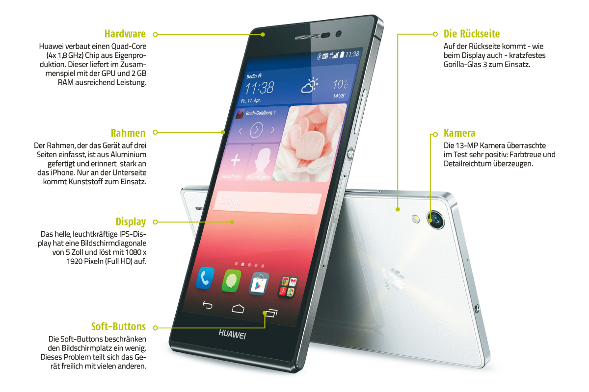 Das Huawei Ascend P7 ist hübsch anzusehen, aus hochwertigen Materialien gefertigt und gut verarbeitet. Bildschirm und Kamera sind einwandfrei. Die Hardware sorgt für weitgehend ruckelfreie Bedienung, absolute Top-Performance gibt‘s jedoch nicht. Dafür lockt ein vergleichsweise niedriger Verkaufspreis.