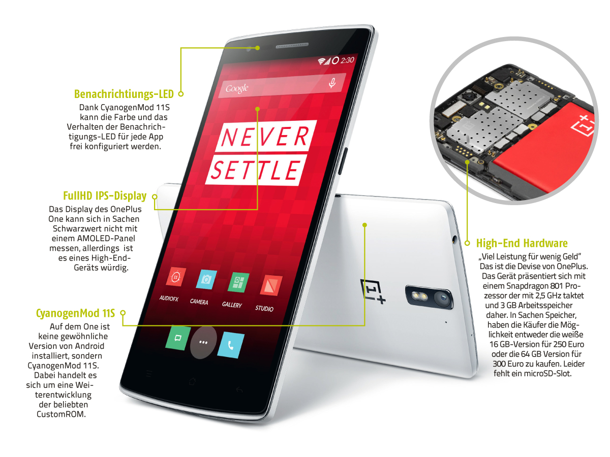 Was die Hardware-Ausstattung betrifft, so liegt das OnePlus One für ein 300 Euro-Gerät eindeutig über allen anderen Geräten dieser Preisklasse. Der größte Konkurrent ist wohl das Nexus 5, welches mit einem Snapdragon 800 und 2 GB RAM ausgestattet ist und derzeit zwar zu den besten Geräten gehört, aber dennoch weit vom One übertroffen wird. Im Inneren des One ist ein Snapdragon 801 mit 2,5 GHz pro Kern gepaart mit 3 GB Arbeitsspeicher zugange. Ein 5,5 Zoll großes FullHD-Display, 16 bzw. 64 GB Speicher und ein 3.100 mAh großer Akku runden das tolle Gesamtpaket ab. Die Rückseite des Geräts ziert eine 13 MP Kamera, während vorne ein 5 MP-Shooter „Selfies“ festhält.