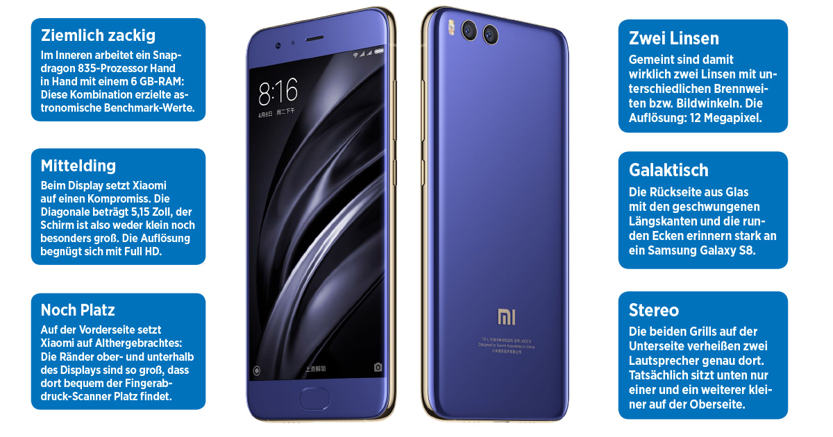 Es klingt oben in der Bildbeschreibung an: Das Mi 6 erinnert auf der Rückseite in der Detailausformung und bei der Materialwahl stark an ein Samsung Galaxy S8. Auf der Vorderseite hingegen kommt das iPhone mit genügend Rand, sodass der Fingerabdrucksensor noch Platz unter dem Display findet. Die Qualität ist tadellos, das Gehäuse sogar wassergeschützt, wenn auch nicht dicht. Das Format des Geräts mit einer Schirmdiagonale von 5,15 Zoll ist traditionell, eben nicht so in die Länge gezogen wie das Top-Gerät von Samsung. Das Telefon liegt dadurch einfach gut in der Hand, wenn auch das Glas auf allen Seiten nicht gerade griffig ist.