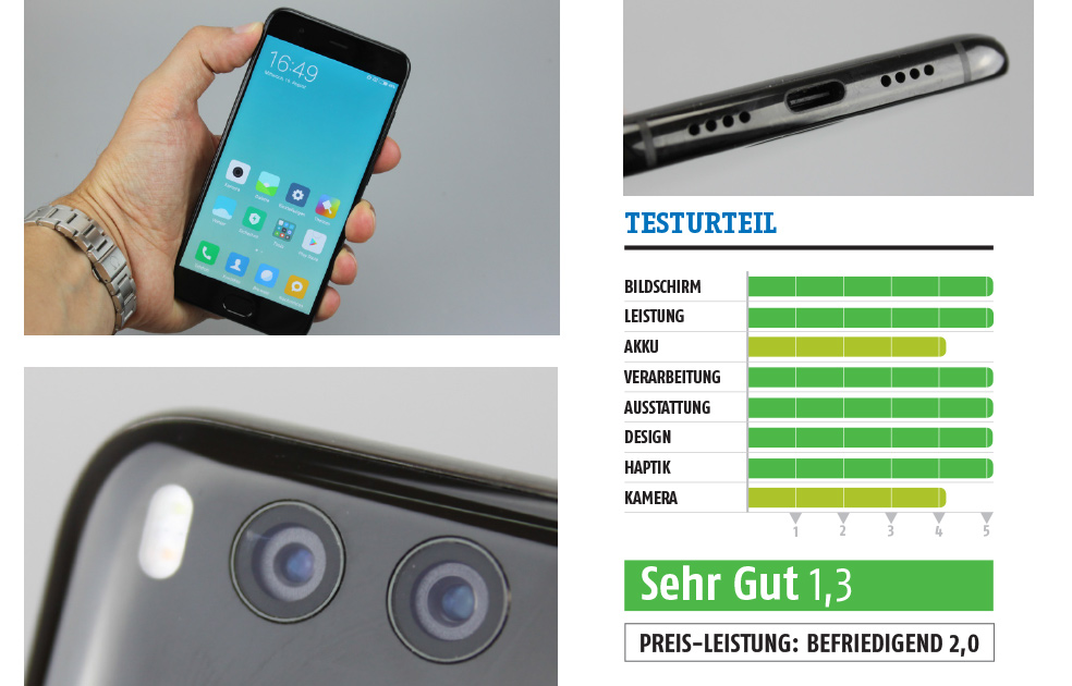 Mit nicht zwingend weniger Superlativen kann man sich dem Speicher widmen. Den Einstieg offeriert Xiaomi bei 64 GB, bietet aber auch eine beim Importeur nur circa 50 Euro teurere Variante mit 128 GB. Aufstocken per SD-Karte ist nicht möglich und wahrscheinlich auch nicht nötig. Wer noch ein paar Euros drauflegt, bekommt das Mi 6 übrigens auch mit Keramikgehäuse.