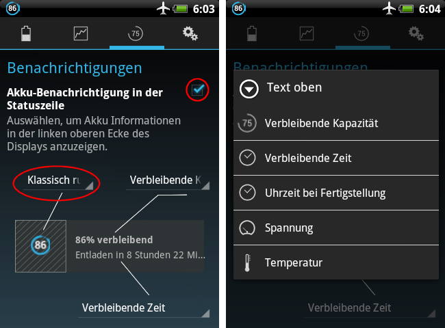 Rechts in der Mitte und rechts unten befinden sich die Optionen „Text oben“ und „Text unten“. Mit ihnen legen Sie fest, welche Akku-Informationen im Benachrichtigungsfenster zu sehen sind. Sie können etwa zwischen der verbleibenden Kapazität, der verbleibenden Zeit und der aktuellen Temperatur wählen.