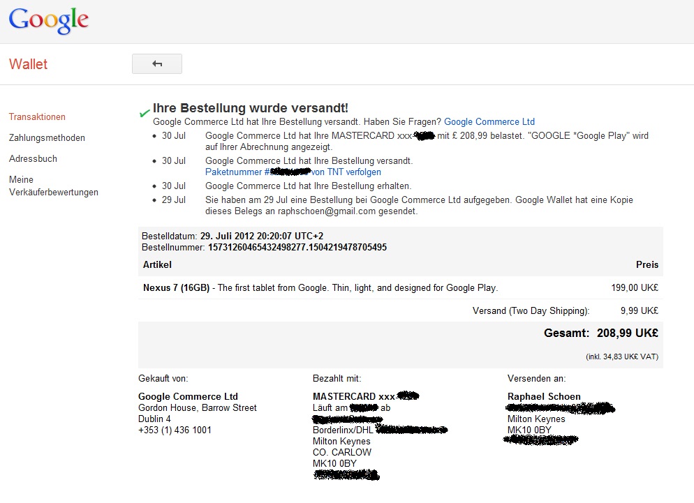 29.07.2012 / 20:20 … ein Nexus 7 16GB im UK Google Play Store bestellt