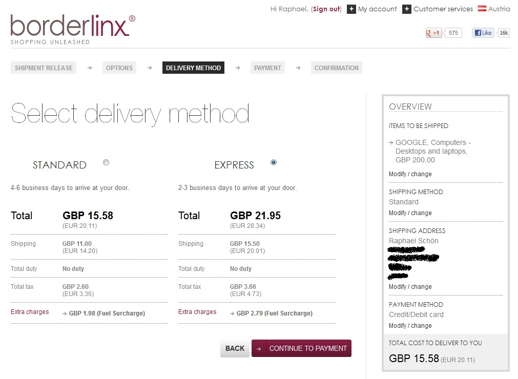 Dann müsst ihr auf der Webseite www.borderlinx.com unter „My Account Links“ auf die Benachrichtigung, dass ein Artikel lagernd ist, klicken. Im Fenster „Shipment release“ müsst ihr nun mit der Zahlungsoption „Credit/Debit Card“ die Bestellung fortsetzen und anschließend noch die Liefermethode „STANDARD“ oder „EXPRESS“ auswählen.