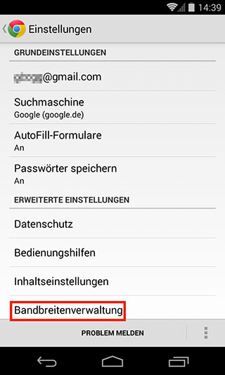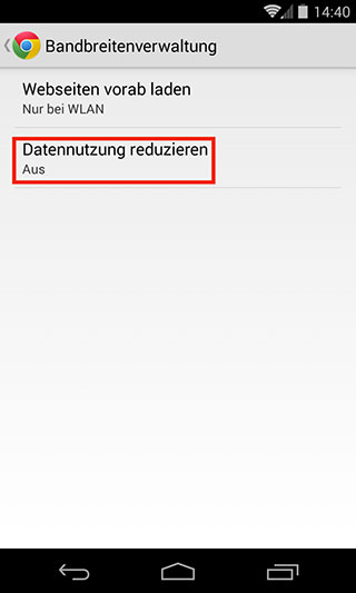 Sie aktivieren diese Funktion, indem Sie den Menüpunkt „Einstellungen“ aufrufen, die Schaltfläche „Bandbreitenverwaltung“ antippen und schließlich im Fenster „Bandbreitenverwaltung“ die Option „Datennutzung reduzieren“ einschalten.
