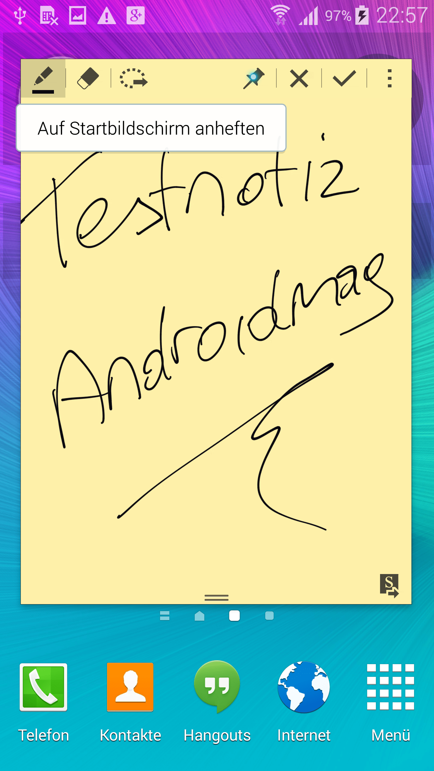 In beiden Fällen öffnet das Note umgehend einen digitalen gelben Notizzettel, auf dem Sie wichtige Infos niederschreiben können. Damit aber nicht genug, die Entwickler haben sich einige Extras einfallen lassen: Neu ist beispielsweise der „S“-Button rechts unten, der die aktuelle Notiz in die hauseigene, S Note genannte Notizen-App von Samsung transferiert. Ebenfalls neu ist die Möglichkeit, den Text als Widget am Homescreen anzuheften. Dazu reicht ein Tipp auf das Stecknadel-Symbol in der oberen Toolleiste.