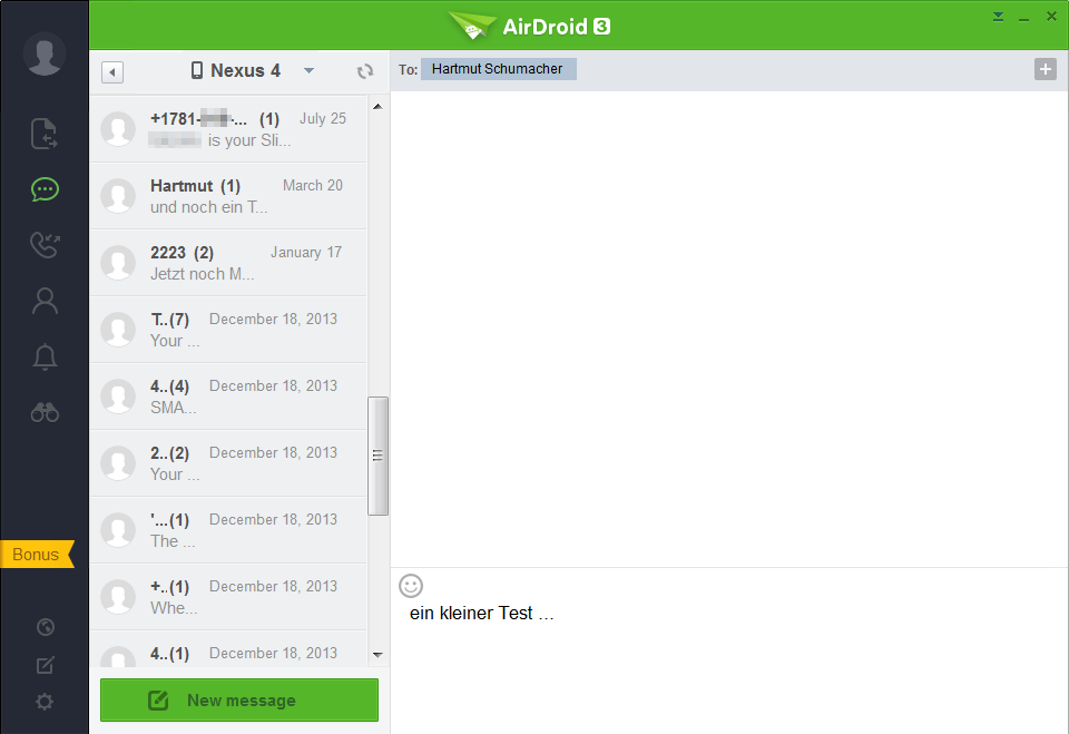 Möchten Sie die SMS-Nachrichten lesen, die sich auf Ihrem Smartphone befinden? Dann klicken Sie am linken Bildschirmrand die „SMS“-Schaltfläche an. Klicken Sie auf eine der Nachrichten, um sich diese Nachricht oder gegebenenfalls die komplette Unterhaltung mit diesem Absender anzeigen zu lassen.
