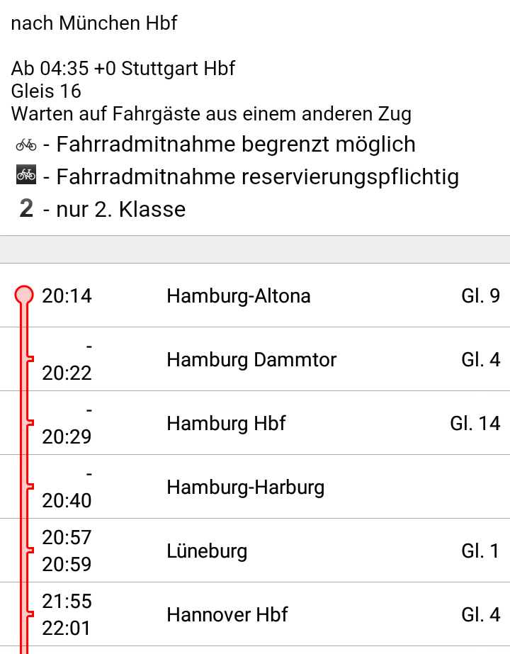 Mit einem Tipp auf die rechte Schaltfläche mit den drei Punkten gelangen Sie zu den Zugdetails, aus denen Sie Fahrtverlauf, Bordservices und gegebenenfalls Verspätungen ersehen können.