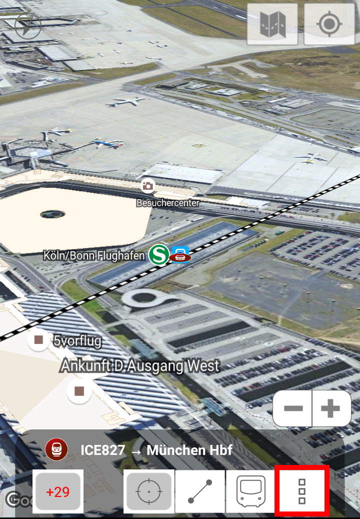 Je nach Gusto können Sie sich den Fahrtverlauf der Züge in der Karten- oder in der Satellitenansicht anzeigen lassen. Sogar eine Orthogonale Darstellung ist möglich. Tippen Sie ein Zugsymbol an, erscheint am unteren Displayrand eine Schalterleiste.
