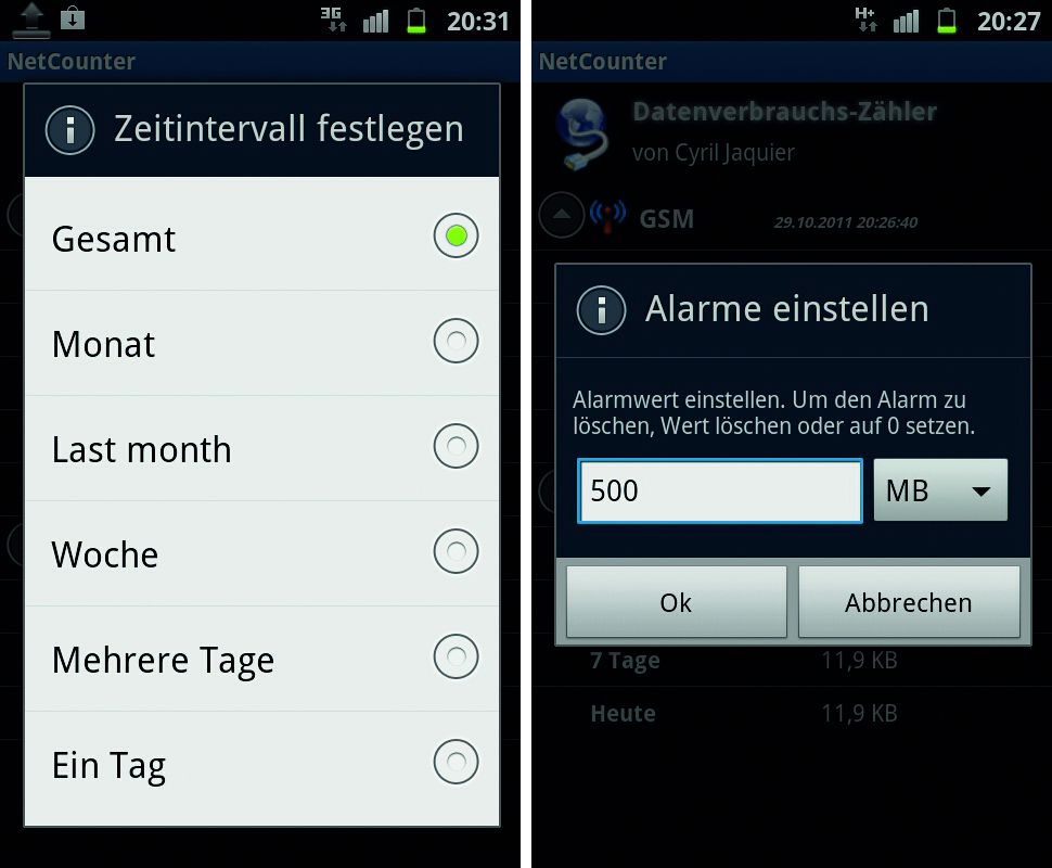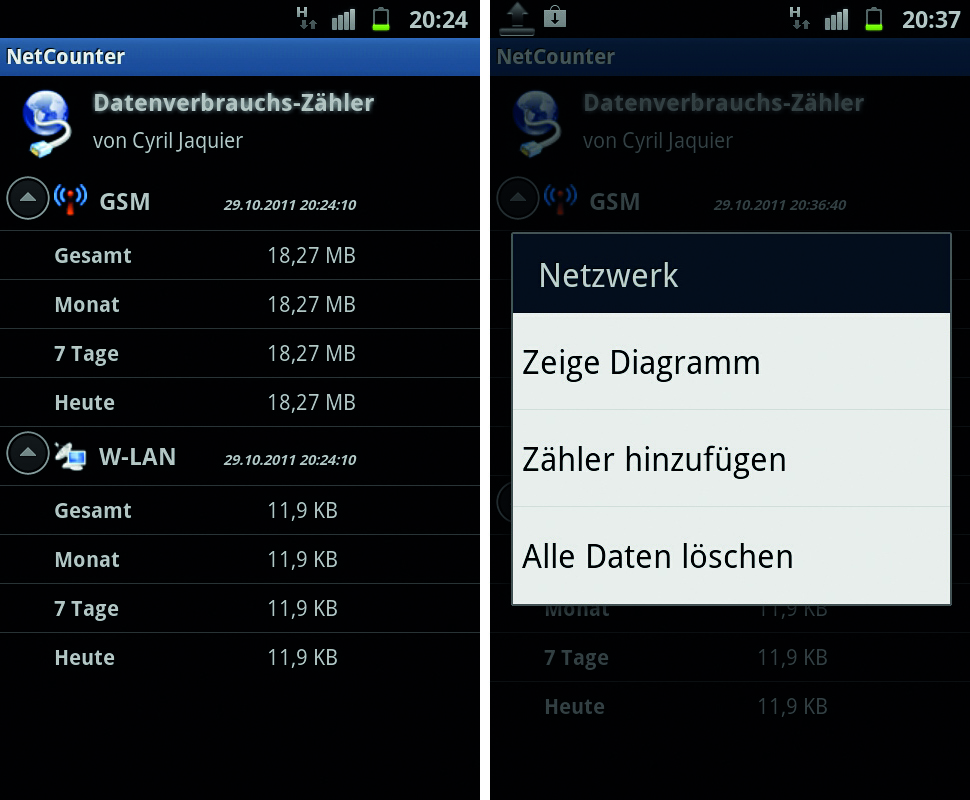 Nach erfolgreichem Download aus dem Android Market beginnt der Zähler zu laufen. Der Datentraffic aus verschiedenen Netzwerken, wie zum Beispiel GSM oder W-LAN, wird separat aufgezeichnet.