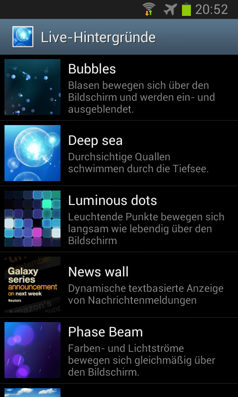 Im Dialogfenster „Hintergrund auswählen aus“ kannst du statt „Galerie“ auch die Schaltflächen „Hintergrund“ oder „Live-Hintergrund“ antippen. Das erlaubt es dir, entweder spezielle (besonders geeignete) Hintergrundbilder auszuwählen oder aber animierte Hintergründe.