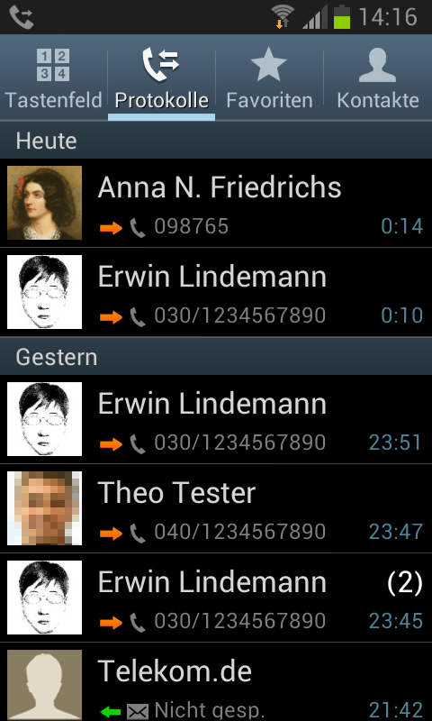 Mit der Schaltfläche „Protokolle“ rufst du die Liste der ein- und ausgegangenen Anrufe und SMS-Nachrichten ab. Tippe einen der Einträge in der Liste an und du kannst diese Nummer entweder anrufen oder aber eine SMS-Nachricht schreiben.