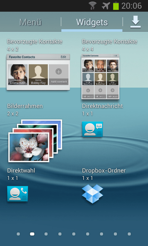 Tippe auf dem Home-Bildschirm die „Menü“-Schaltfläche an. Wechsle dann zum Register „Widgets“. Blättere durch die Liste der vorhandenen Widgets (indem du den Finger nach links oder rechts über den Bildschirm ziehst), bis du das gewünschte Widget gefunden hast.